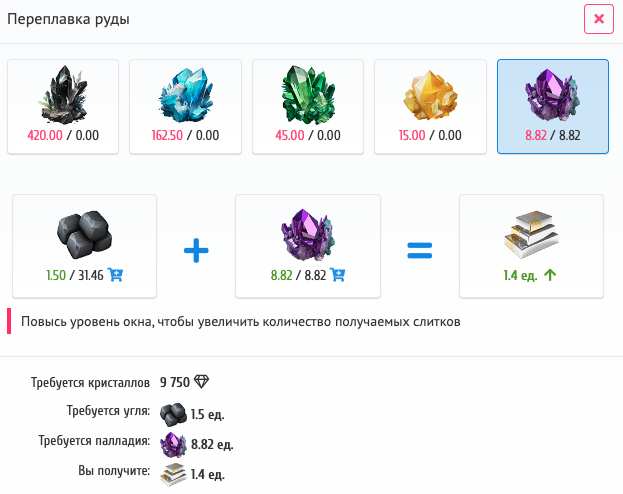 Видим, что нам требуется 1,5 угля и 8,82 палладия для получения 1,4 слитка. Окей, поехали считать! Покупаем это всё на бирже по средней цене и запускаем переплавку. Ждем, когда наши бравые сотрудники переплавят руду и уголь в слитки. Выплачиваем ЗП, продаем слиток и идём считать доходность!