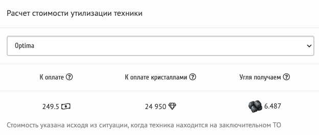 Итак, к нам приходит первый клиент на старенькой изношенной «Optima»! Ставим эту старую ржавую развалюху на переработку. Для простоты всех расчётов: износ этой развалюхи был таков, что мы заплатили таксисту всего 249.5 TXM. Берём только одного клиента, чтобы наша математика была девственно чиста. Дожидаемся когда сотрудники полностью утилизируют это корыто, чтобы иметь все цифры под рукой. У нас имеется 15 сотрудников с зарплатой 20% — выплачиваем зарплату сотрудникам, продаем уголь. Всё! Теперь у нас имеются абсолютно все вводные, чтобы посчитать сколько же можно заработать.