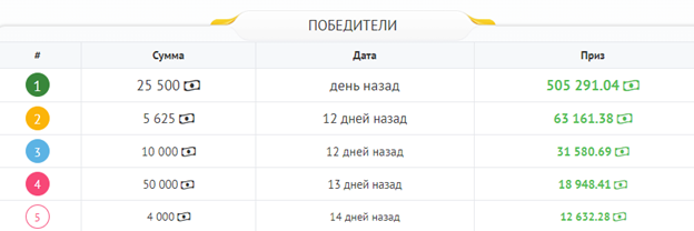 Основной джекпот выигрывают последние 5 пользователей, сделавших пополнение, при этом сумма приза распределяется так:
