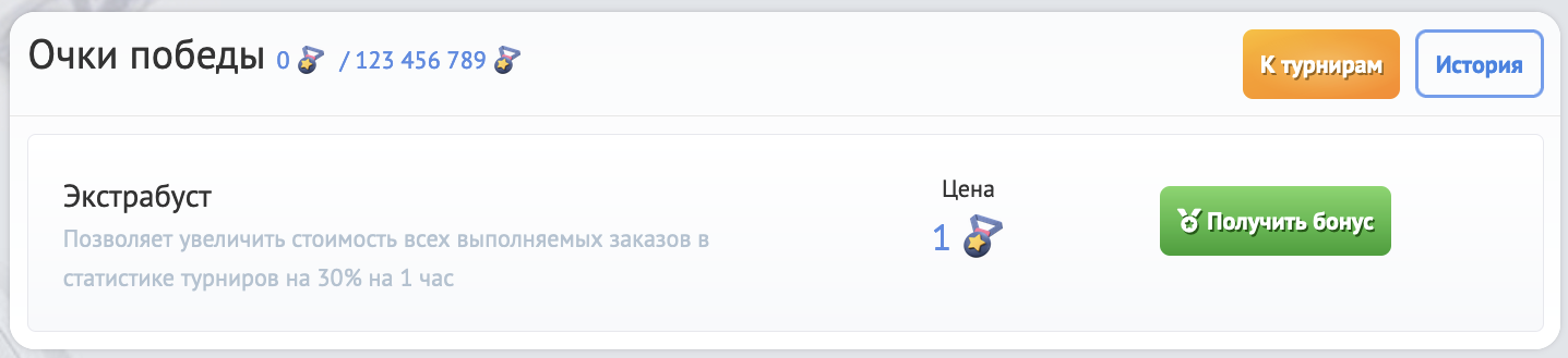 • Экстрабуст: позволяет увеличить стоимость всех выполняемых заказов в статистике турниров на 30% на 3 дня.