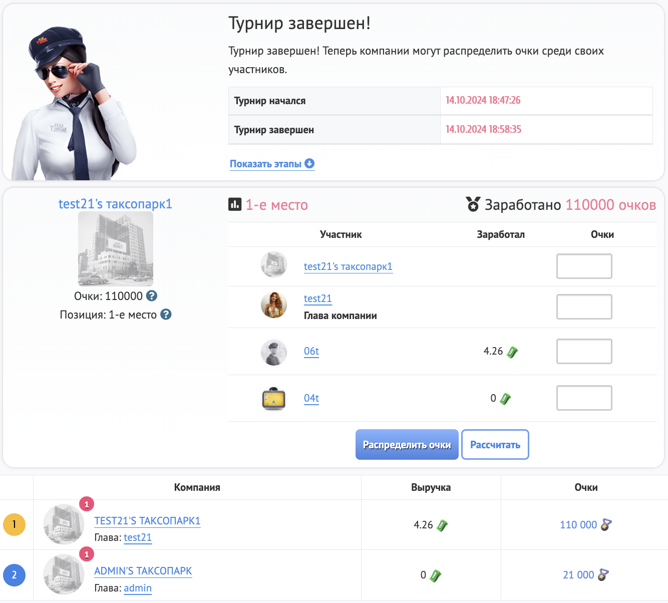 После завершения Турнира владелец Таксопарка или Горной компании может распределить Очки победы среди сотрудников, которые защищали честь компании в Турнире и/или может потратить заработанные Очки победы на получение особых бонусов для Горных компаний.