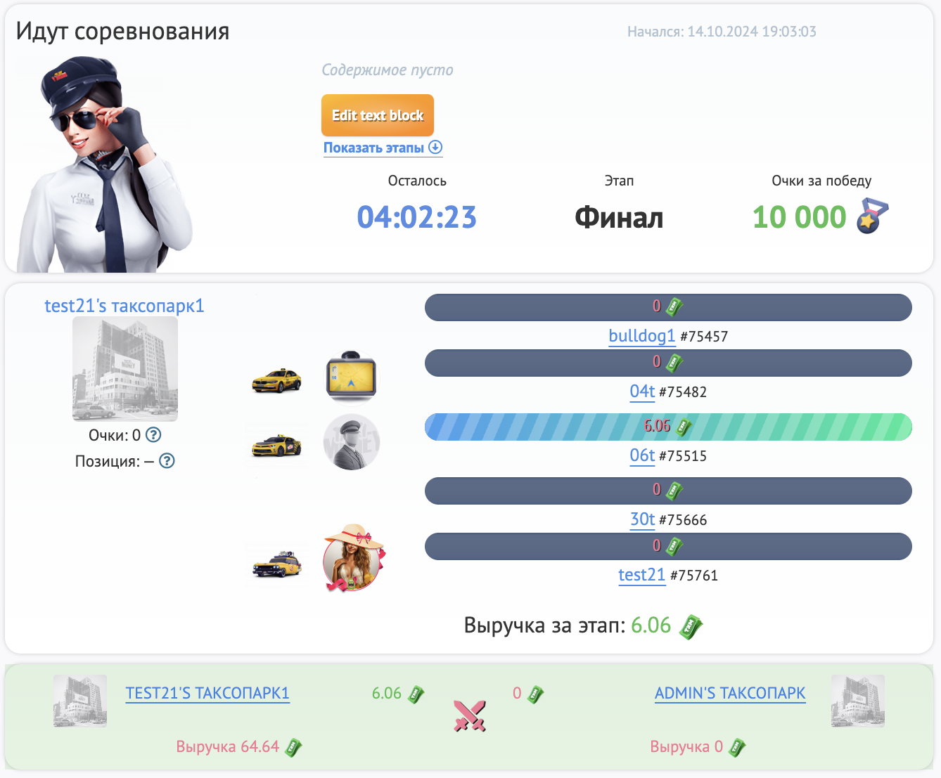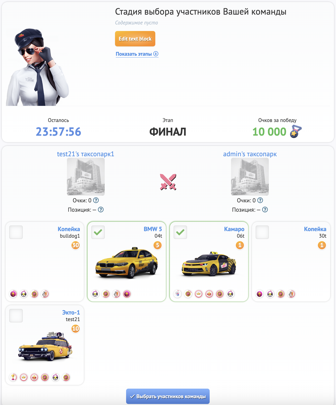 В начале каждого этапа владелец компании (Таксопарка или Горной компании) выбирает участников своей команды из числа своих сотрудников. Для этого необходимо кликнуть по технике своих сотрудников.