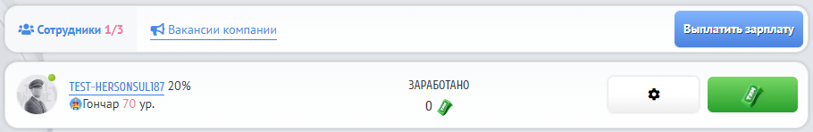 После того, как у Вас появятся сотрудники, на этой вкладке Вы сможете изменять размер их вознаграждения — от 20% до 80% от стоимости заказа (для этого воспользуйтесь серыми кнопками с шестерёнками) и выплачивать им зарплату (для этого воспользуйтесь зелёными или красными кнопками справа).