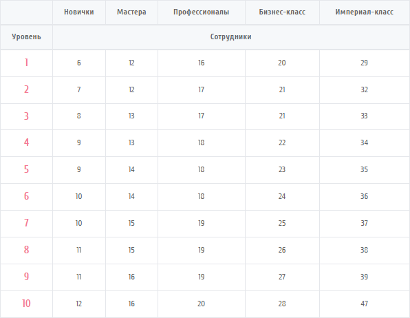 Максимальное количество сотрудников растёт по мере развития горных компаний — по мере перехода от одного ранга к другому.
