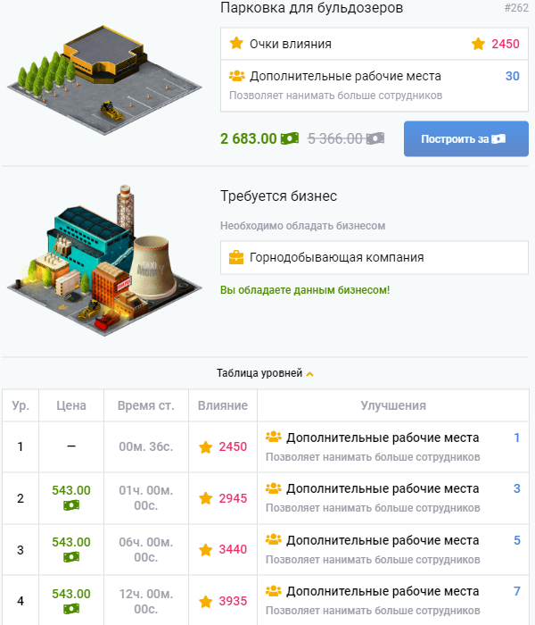 Кроме того, Вы можете обеспечить дополнительные рабочие места в своей горной компании. Для этого необходимо построить здание для бизнеса «Парковка для бульдозеров» на интерактивной карте Полиса и развивать его.