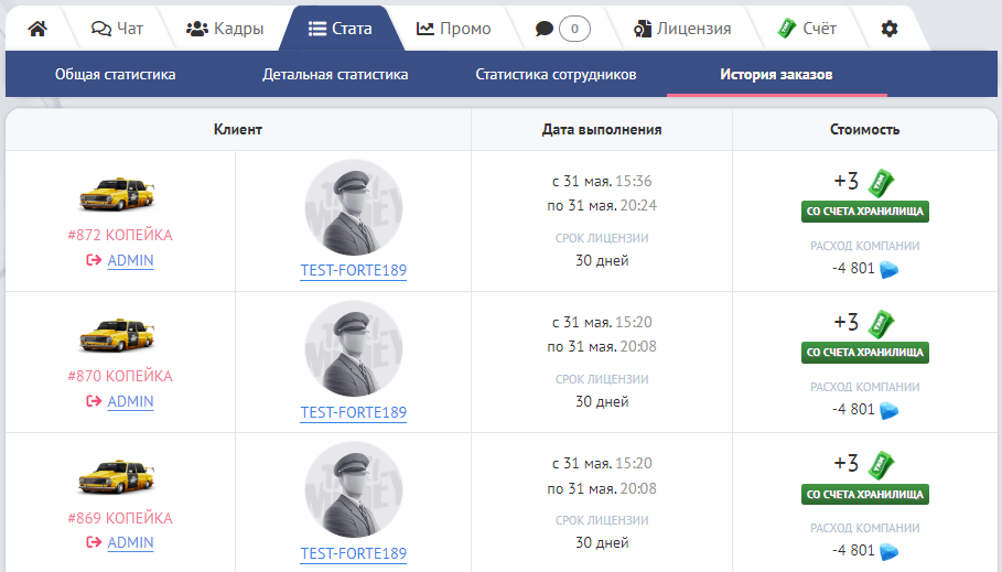 Вкладка «Стата» содержит подробную статистику о работе Диспетчерской в целом, и каждого из её сотрудников в отдельности.