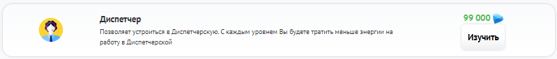 Изучите навык «Диспетчер», чтобы получить возможность работать в Диспетчерской компании. Для этого перейдите в раздел «Мой офис», нажмите на кнопку «Прокачать навыки» в блоке «Навыки» и далее нажмите на кнопку «Изучить» рядом с навыком «Диспетчер».