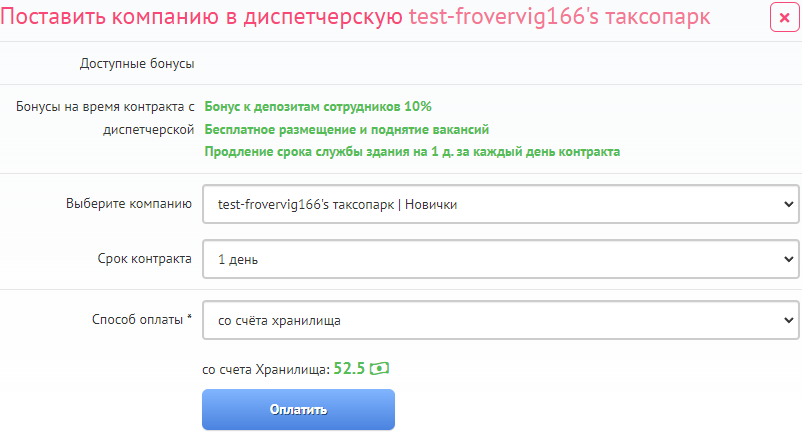 Затем выберете срок контракта и счет оплаты, оплатите контракт с Диспетчерской, и бонусы для заказов Вашего Таксопарка или Горной компании начнут действовать.