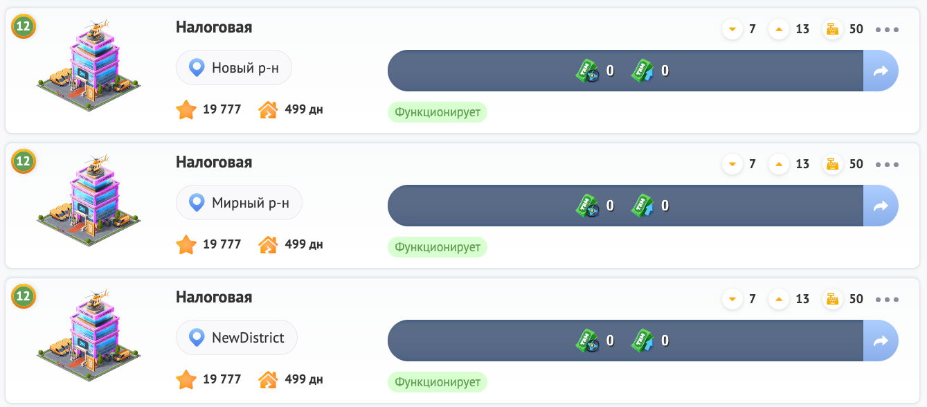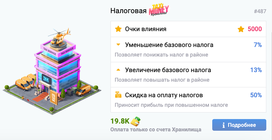 Здание Налоговой нужно для того, чтобы Вы могли получать повышенный доход от всех финансовых операций в игре, а также скидку на оплату налогов!