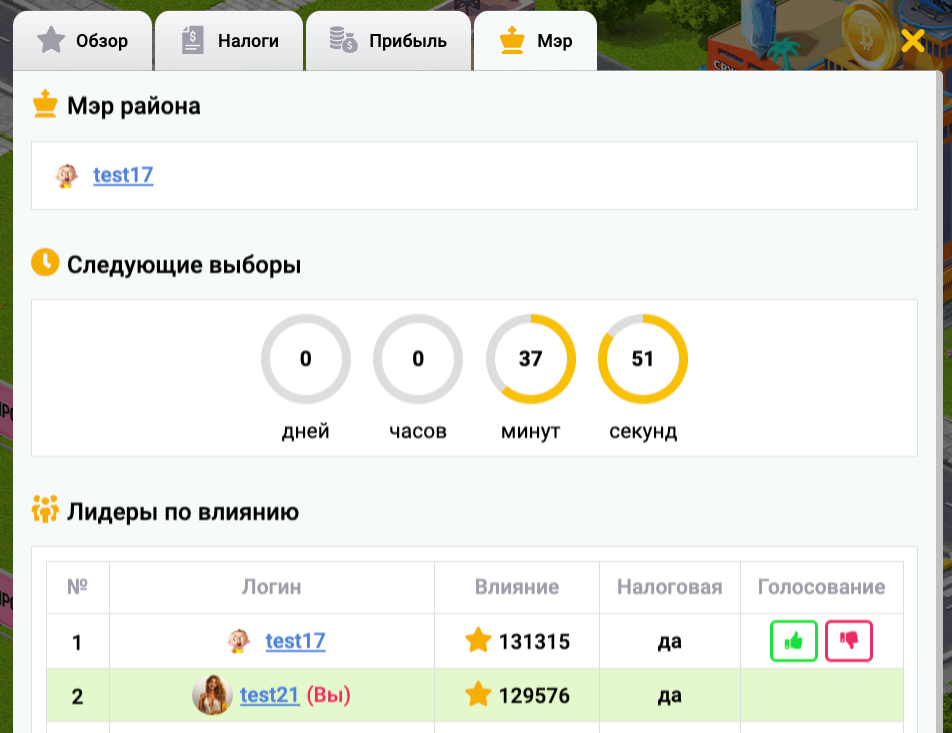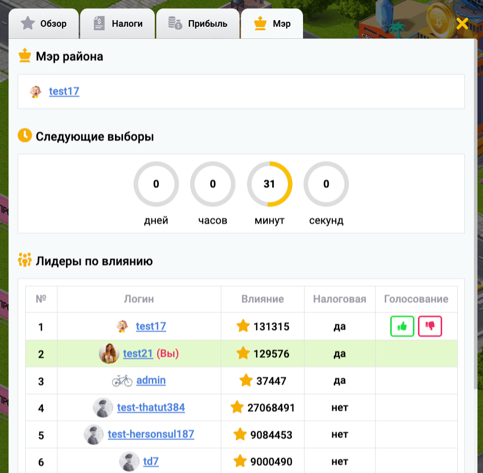 Выборы мэра проходят каждую неделю среди пользователей, построивших налоговые в данном районе.