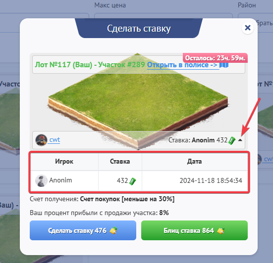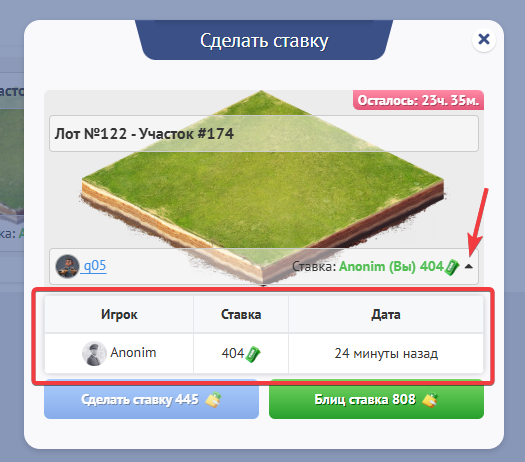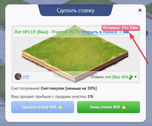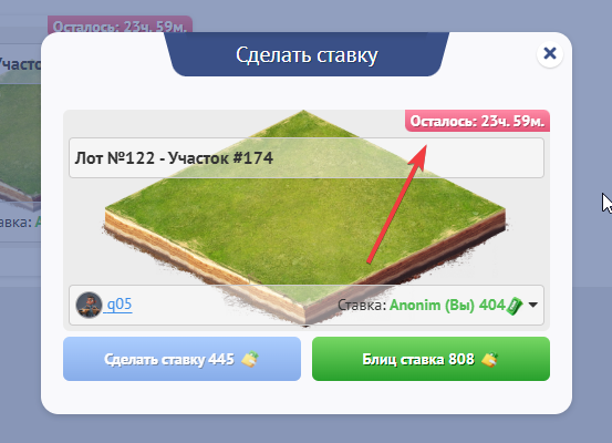 После того, как таймер закончится участок перейдет под владение пользователя, который сделал последнюю ставку, если до этого, кто - то не купит данный лот блиц ставкой.