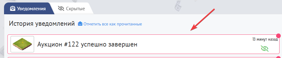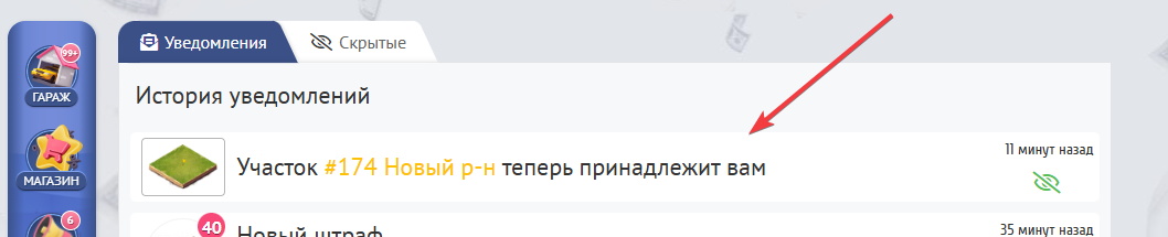 После победы на аукционе, Вы увидите уведомление о его окончание и принадлежащим Вам участке.Он будет показан в Ваших Владениях