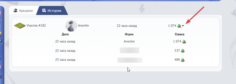 Также здесь Вы можете наблюдать за историей ставки по конкретному лоту, достаточно просто кликнуть на этот черный треугольник