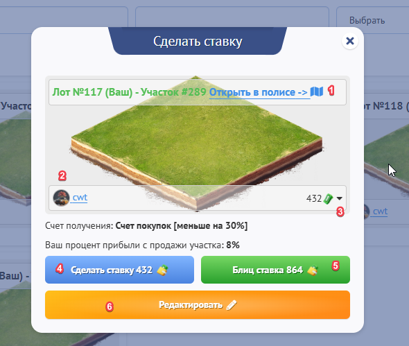 Изменить название участка, добавить описание, добавить картинку лота, выбрать один из счетов: покупок(Вы получите меньше на 30%), пассажирский(Вы получите меньше на 30%), вывода. А также процент прибыли с продажи участка, здесь важно подметить, что Вы можете только уменьшать процент с прибыли.
