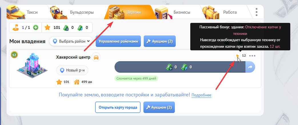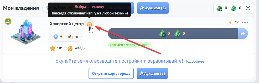 Это уникальное строение, которое мы сделали специально для Вас, чтобы улучшить Ваш геймплей в игре. Приобретя “Хакерский центр”, Вы навсегда сможете отключить прохождение капчи на выбранной Вами технике в Вашем гараже, будь то такси или бульдозер вне зависимости от района, в котором они работают!