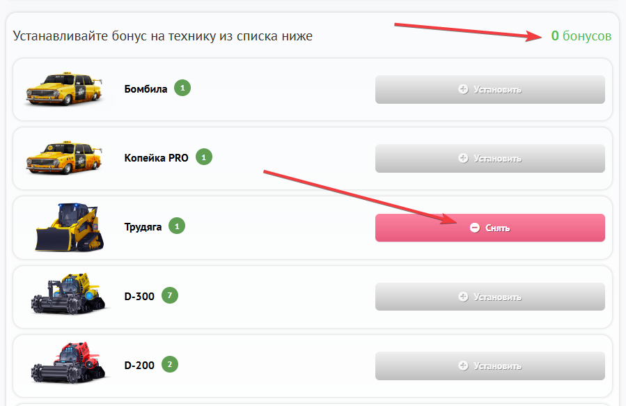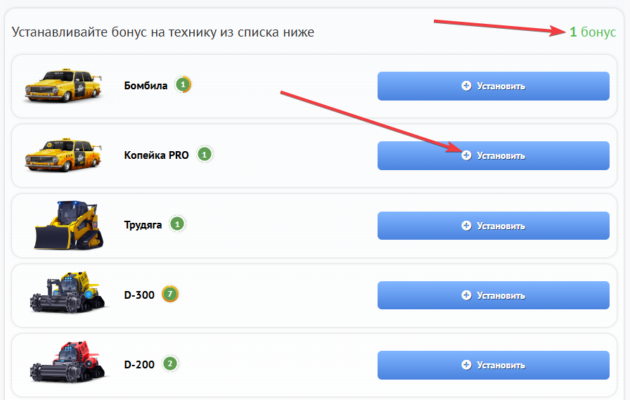 Отображение бонуса на технике также присутствует как в Гараже