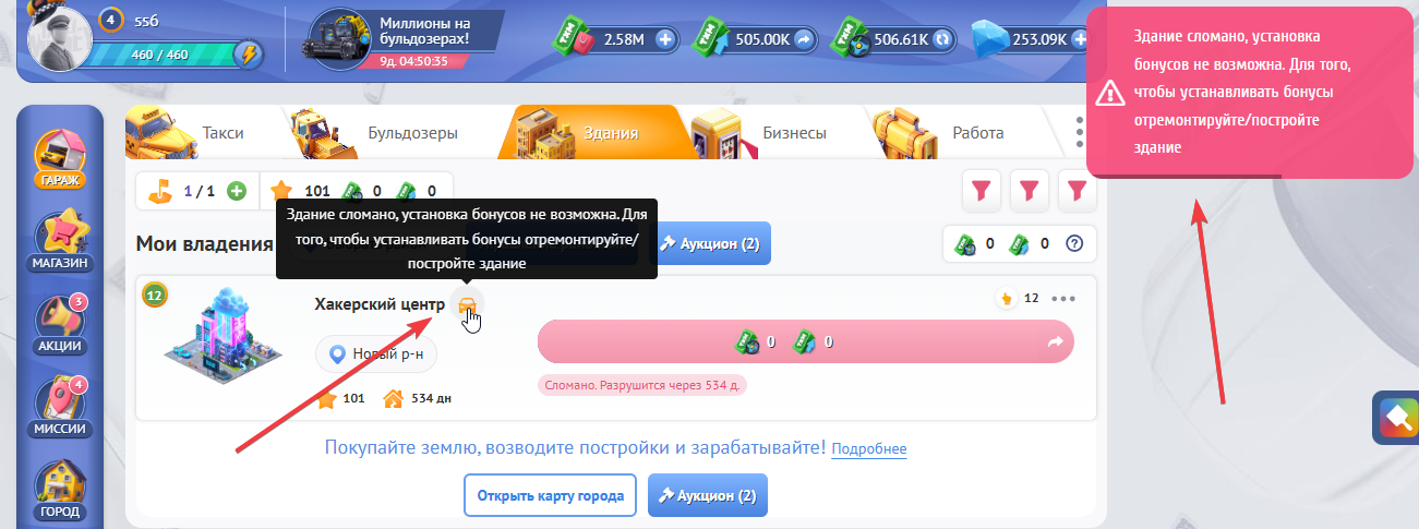 Если у Вас закончились бонусы от Хакерского центра, но Вы еще не повысили его уровень до максимального, то при взятии заказа, Вам будет показана подсказа, о том, что для получения бонуса Вам не обходимо увеличить уровень здания.