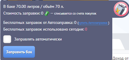 Заправка происходит по клику на бак или автоматически если активировать эту функцию, в окне бака кликнув на его иконку, со счета покупок.