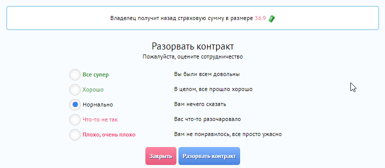 После завершения контракта (когда кто-нибудь один разорвал контракт) – оба пользователя могут обменяться отзывами.