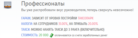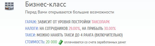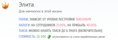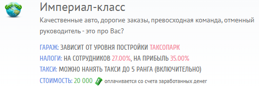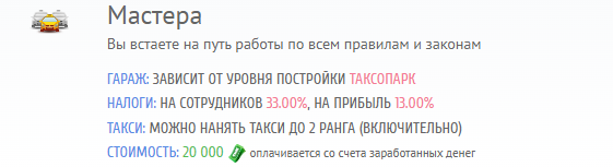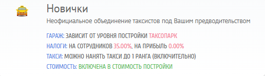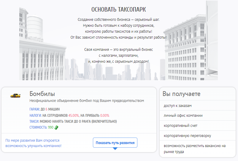 Вы может начать развитие компании с уровня “бомбилы” - только заказы нулевого уровня и стартовая машина “бомбила” или с уровня “новички” на котором вам будут доступны заказы и машины 1 ранга. Единственным дополнительным требование для уровня “новички” является наличие здания таксопарка в полисе.