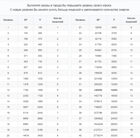 Всего 40 уровней игрока. С новым уровнем Вы можете купить больше лицензий и увеличивается количество энергии.