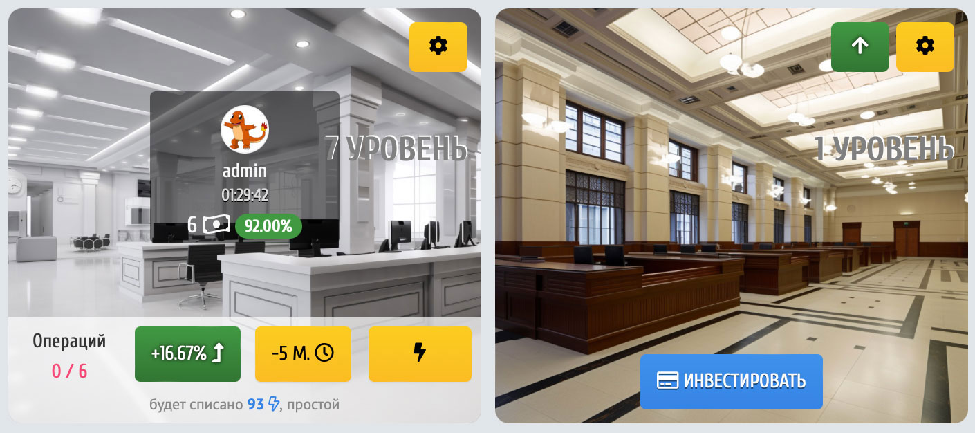 To open your bank, you need to build a Bank building on a free plot in Polis. Upgrade the level of your Bank building to increase the number and available level of working windows, as well as the maximum possible number of employees! Develop Bank workplaces to increase the maximum possible profitability of your clients!